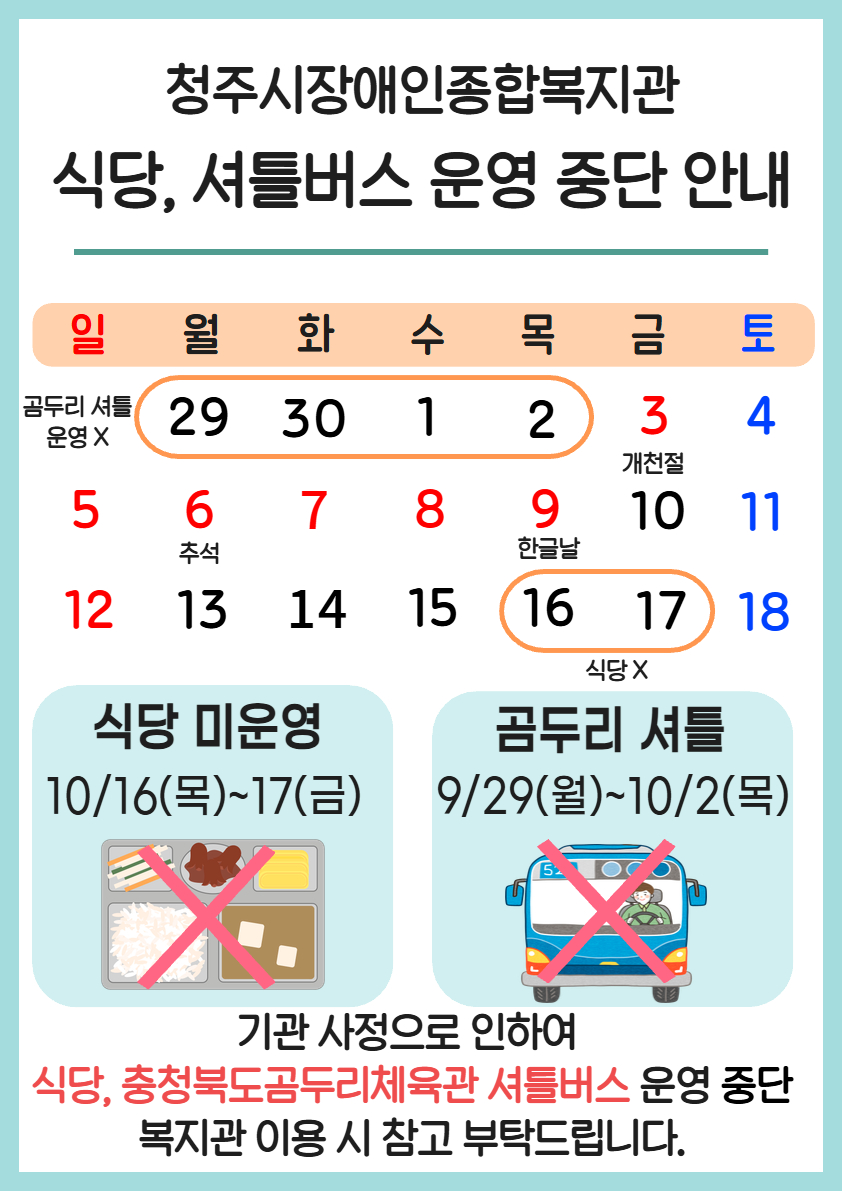 - 충청북도곰두리체육관 담수 휴장으로 인한 셔틀버스 미운영 : 9/29~10/2(공휴일 미운영)