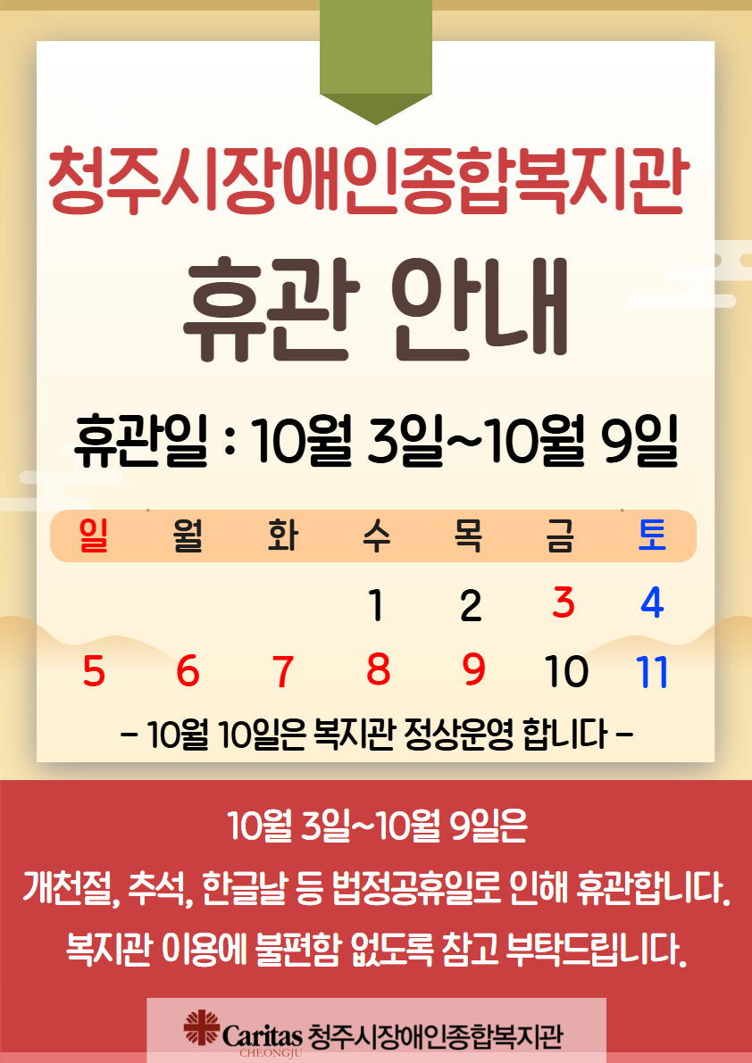 [안내] 청주시장애인종합복지관 휴관 및 일부 미운영 관련 안내