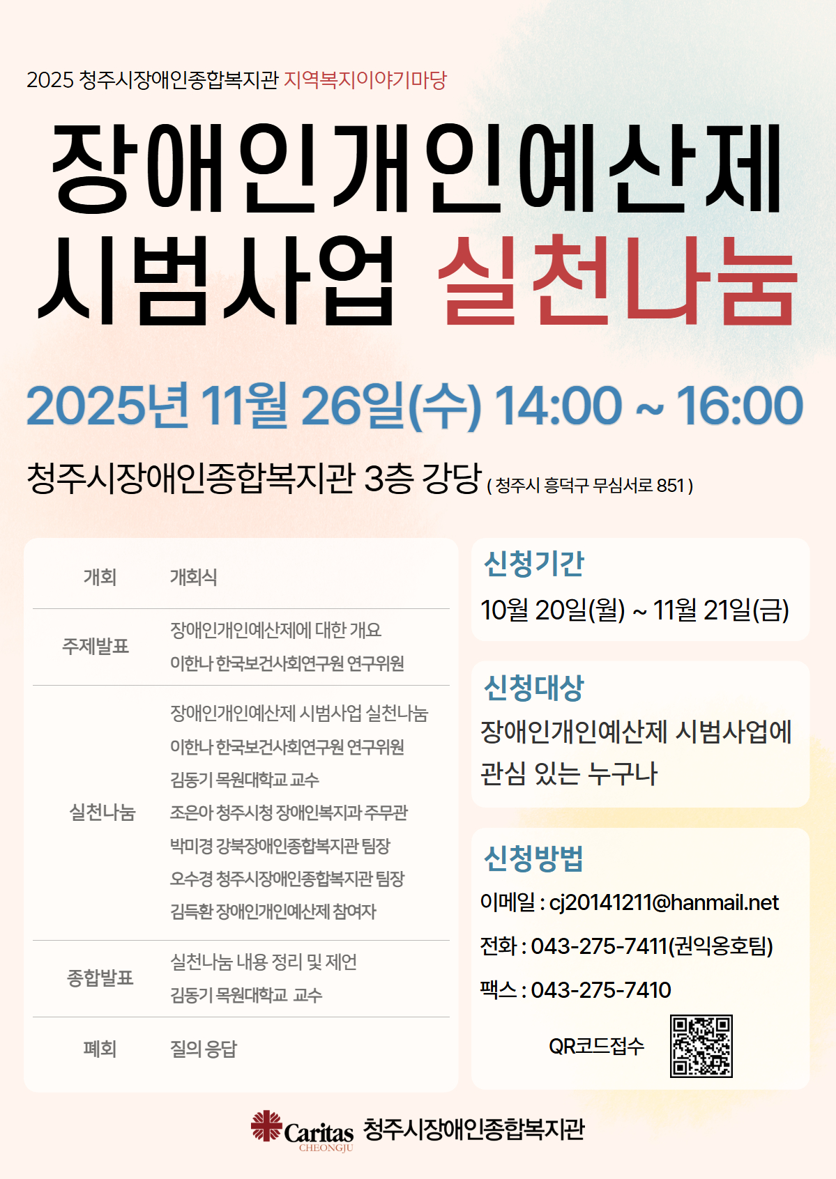 청주시장애인종합복지관은 2025년 장애인개인예산제 시범사업 복지전문기관으로 참여하였습니다.