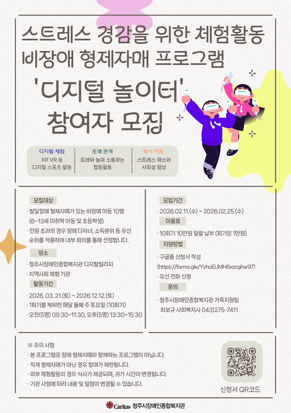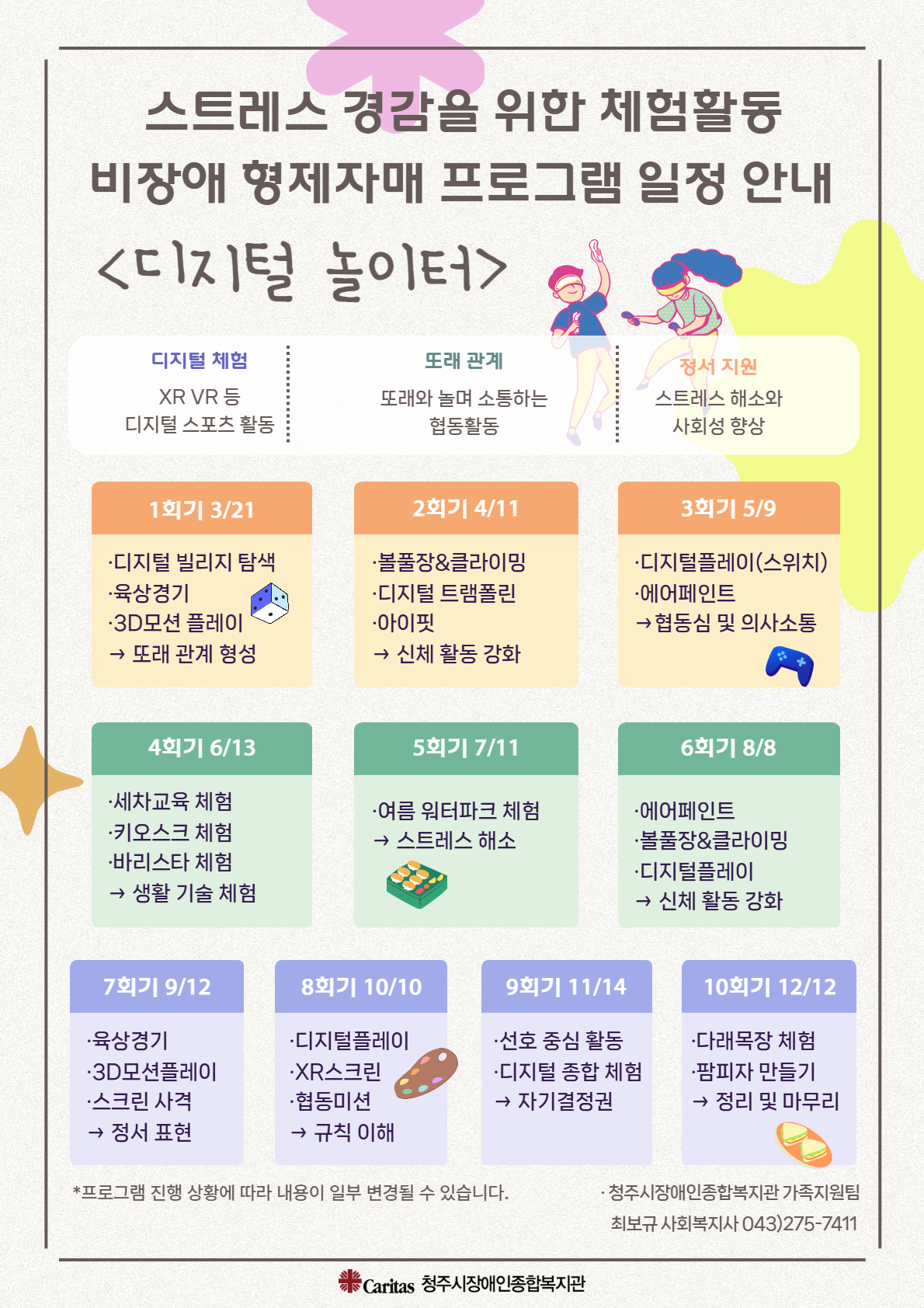 청주시장애인종합복지관은 발달장애 형제자매가 있는 비장애 아동을 대상으로 또래 친구들과 함께 디지털 기술을 접목한 체험활동을 제공하고자 합니다. 많은 관심과 신청 부탁드립니다.