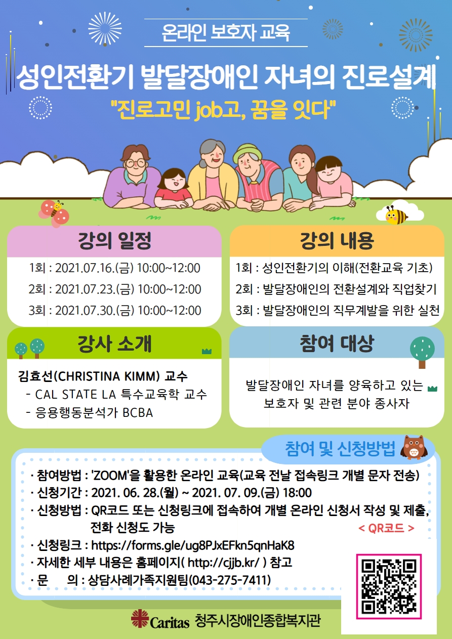 청주시장애인종합복지관에서는 2021년 온라인 보호자 교육 "성인전환기 발달장애인 자녀의 진로설계" 참여자 모집을 진행합니다.